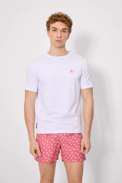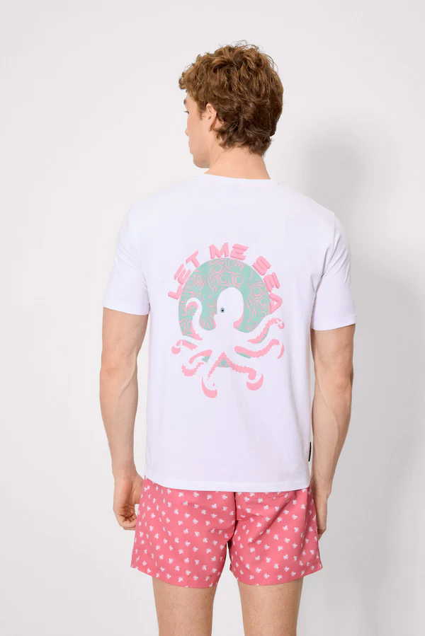 Esto hace que sea una camiseta fácil de combinar con bañadores, bermudas o pantalones cortos, creando un look desenfadado y actual.