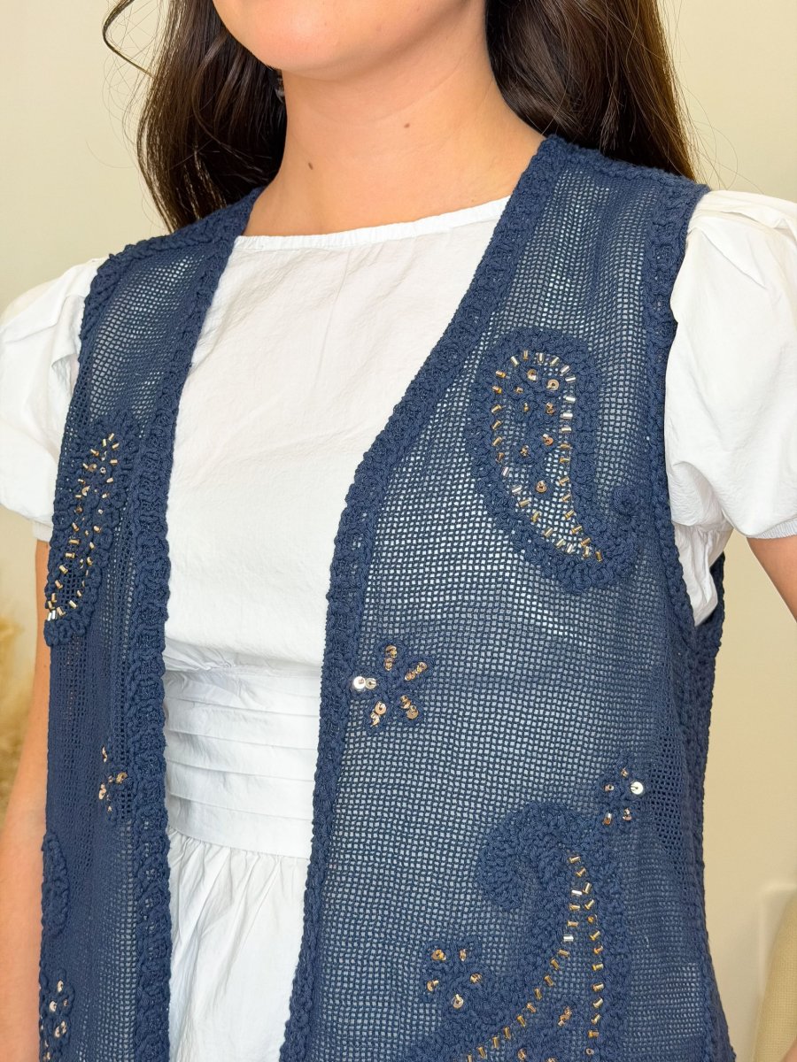 Este chaleco en azul oscuro tiene ese encanto boho que tanto nos gusta. Es de esos que te pones encima de una camiseta o un vestido sencillo… y de repente todo el look cambia.