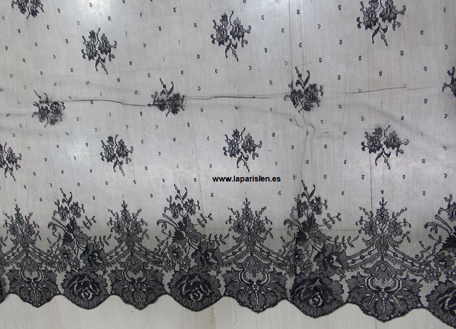 Es una mantilla negra de encaje fino, con bordes ricamente festoneados y motivos florales clásicos, muy trabajada y elegante. El tejido es ligero y semitransparente, lo que permite que el dibujo destaque sin recargar.