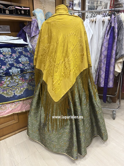 Elegante mantón adamascado en color mostaza, una pieza tradicional y clásica ideal para realzar cualquier traje regional. Confeccionado en rayón de alta calidad, destaca por su suavidad, caída fluida y un delicado dibujo clásico que aporta distinción y autenticidad.