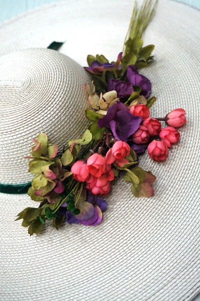 Así de ideal es esta pamela beige con flores silvestres , donde lo natural destaca, y los colores combinando rosas y morados se mezclan entre una lazada de terciopelo verde