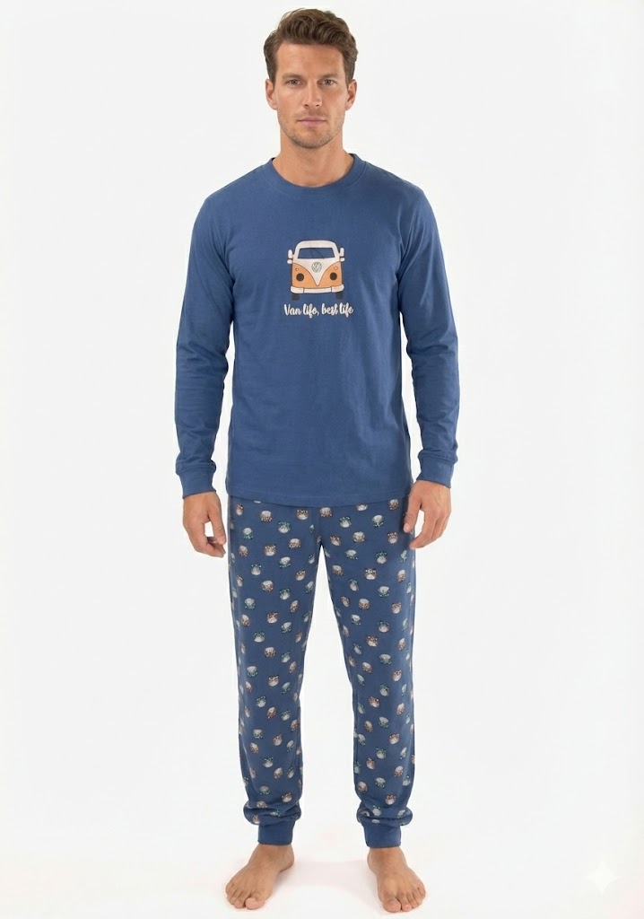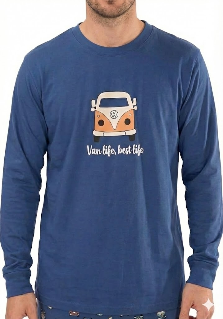 Camiseta azul con estampado frontal de furgoneta, pantalón estampado con furgonetas