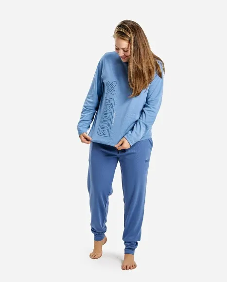 Pijama confeccionado con tejido de gran suavidad y muy confortable por su calidez y tacto. Camiseta color azul, destaca el logotipo estampado en gran formato en purpurina azul más oscuro.