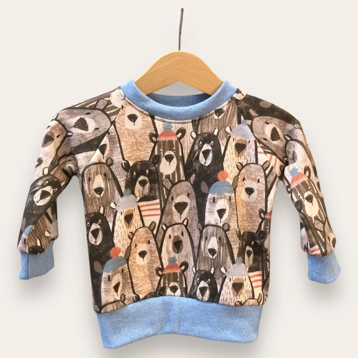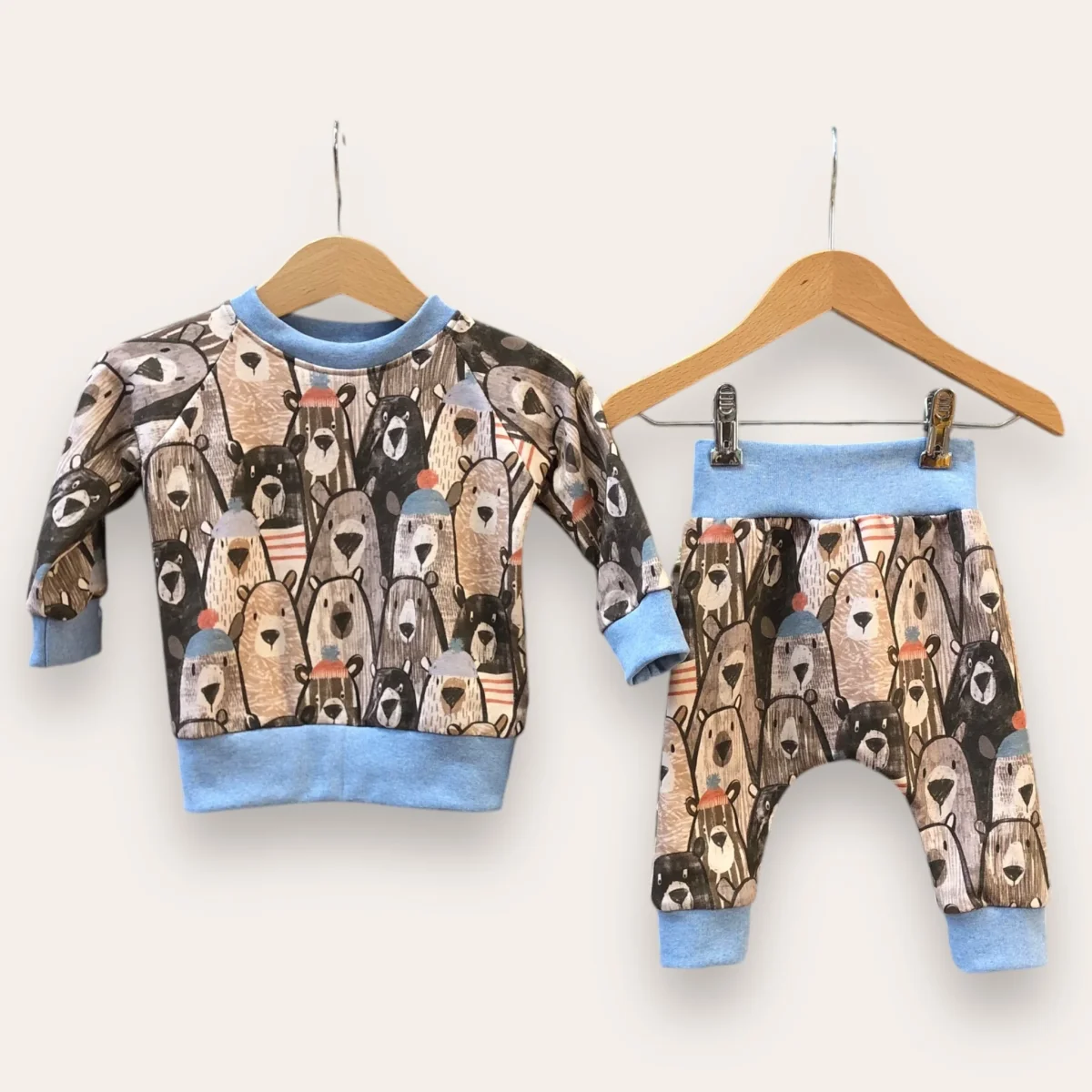 Conjunto de sudadera y pantalón estampado en osos combinado con azul. Suave tejido de sudadera. Algodón 95%, elastan 5%.